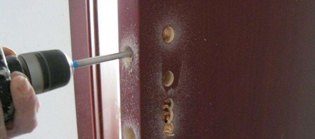 用手槍鉆或木工開孔器在門板上打大小約35毫米的合頁安裝孔,深度約為12毫米。